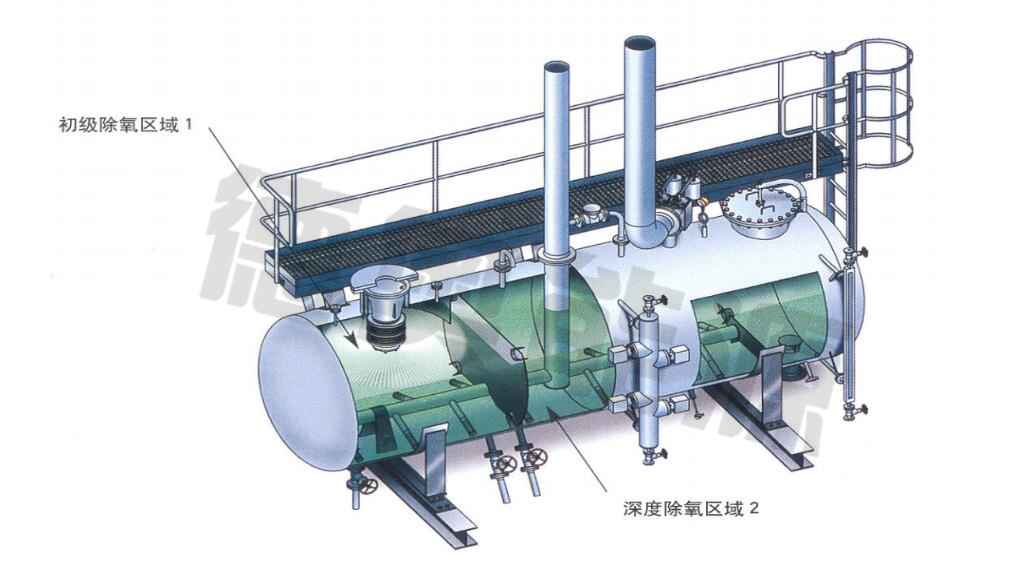 內(nèi)置式無(wú)頭除氧器由除氧水箱本體、恒速噴嘴、二次加熱蒸汽排管系統(tǒng)、調(diào)節(jié)閥組、壓力及溫度傳感器、控制系統(tǒng)及耐高溫水泵等組成。