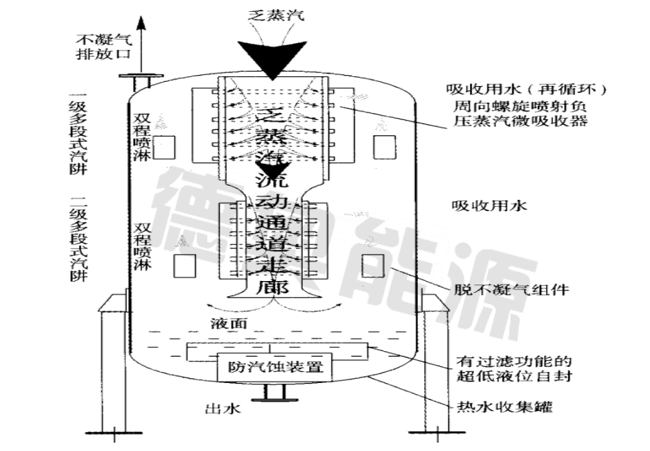 北京德奧公司則采用多段沿程走廊吸收方式,通過快速高效汽阱吸收室和多程噴射降淋室產(chǎn)生的卷吸作用,使乏汽在流動過程中被逐步分段吸收。由于乏汽一直處于流通中,系統(tǒng)不存在被憋壓的問題,而且乏汽流動窄間直徑大,可以確保低壓乏汽能夠大量流過和吸收,尤其適合于乏汽流量壓力不穩(wěn)定、排汽設(shè)備對排汽背壓比較敏感、分離不凝氣體較多的場合。DA-FH系列乏汽回收器是此類技術(shù)的代表。