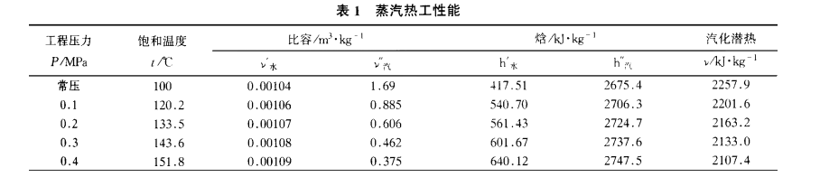 抽汽噴射器的節(jié)能效益,集中體現(xiàn)在增加回收了一部分原來可能要排放的乏汽的熱量。應(yīng)該承認,噴射器本身就是一種效率比較低的流體設(shè)備,再加上水和水蒸氣在比容方面的巨大差別,使得噴射器的抽汽能力突出到工作流體抽吸乏汽并盡可能地促使凝結(jié)的過程上面。蒸汽熱工性能見表1。